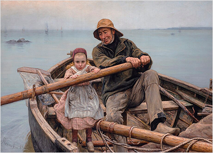 소녀의 작은 손은 노 위에 살짝 얹혀 있을 뿐이고,